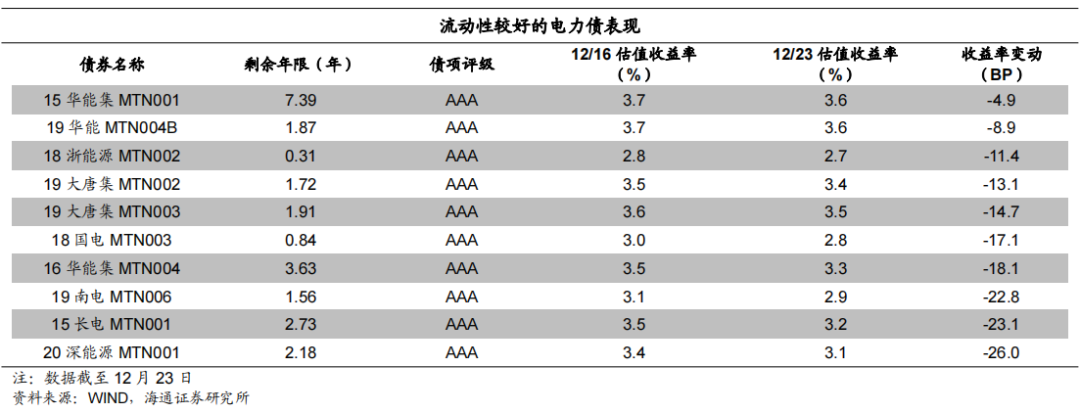 本周我们观测的电力债样本中,代表性债券的收益率整体下行。具体来看,15华能集MTN001下行4.9BP,19华能MTN004B下行8.9BP,18浙能源MTN002下行11.4BP,19大唐集MTN002下行13.1BP,19大唐集MTN003下行14.7BP,18国电MTN003下行17.1BP,16华能集MTN004下行18.1BP,19南电MTN006下行22.8BP,15长电MTN001下行23.1BP,20深能源MTN001下行26BP。![]()