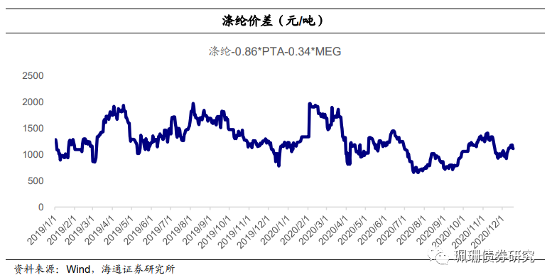 涤纶价差小幅回落。截至12月18日,POY-0.86*PTA-0.34*MEG价差为1117元/吨,环比下降14元/吨。