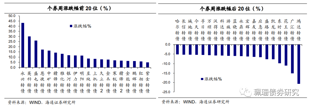 个券表现,跌多涨少。个券93涨3平239跌。个券涨幅前5位分别是永兴转债(43.21%)、英科转债(30.04%)、盛屯转债(26.01%)、恩捷转债(17.21%)、中矿转债(16.21%)。跌幅前5位分别是凯龙转债(-7.67%)、东时转债(-9.76%)、花王转债 (-10.98%)、广汇转债(-15.06%)、鸿达转债(-20.71%)。
