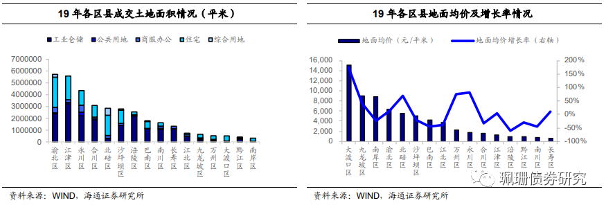 价格端,大渡口区2019年地面均价及增长率均一马当先。WIND口径下,在有土地出让数据的16个区县中,大渡口区地面均价及增长率均排名第一,分别近15179.14元/平米、173.05%,成为唯一的地面均价每平米破万元的区县,同时也是唯一的增速破100%的区县。2019年地面均价每平米小于1000元的共4个区县,分别为涪陵区、黔江区、南川区、长寿区,其中长寿区地面均价最低,仅约605.44元/平米。地面均价增长率方面,增速为正和为负的区县各为8个,其中涪陵区增速最小,仅约-61.98%。
