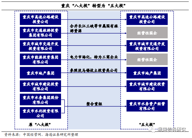 重庆市城投体系经历了“由一分八,由八变五”的演变过程。2006年以前重庆城投体系由八家集团企业组成。受地方融资规范、国企改革、地方债务压力等影响,在市政府主导下,“八大投”向“五大投”格局转型。