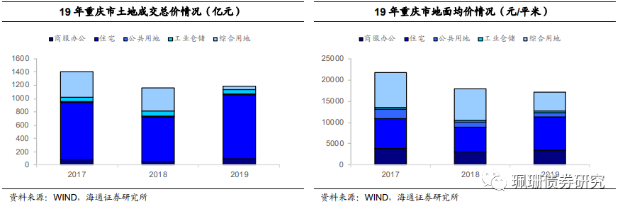 2019年重庆市土地成交总价及地面均价均较18年有小幅上升。WIND口径下,2019年重庆市土地成交面积同比增速-0.37%,成交总价近1184.98亿元,同比增加2.13%,地面均价约3405.32元/平米,同比增加2.50%。其中,住宅成交总价最高,近958.25亿元,且地面均价最高,约7911.53元/平米;公共用地成交总价最低,约8.57亿元;工业仓储地面均价最低,约为413.57元/平米。