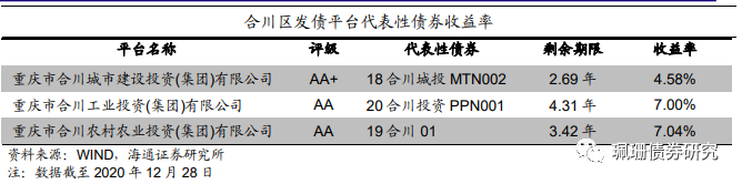 合川区的发债平台共3家,分别为重庆市合川城市建设投资(集团)有限公司、重庆市合川工业投资(集团)有限公司、重庆市合川农村农业投资(集团)有限公司。仅重庆市合川城市建设投资(集团)有限公司信用评级为AA+,其余两家为其子公司,评级均为AA。