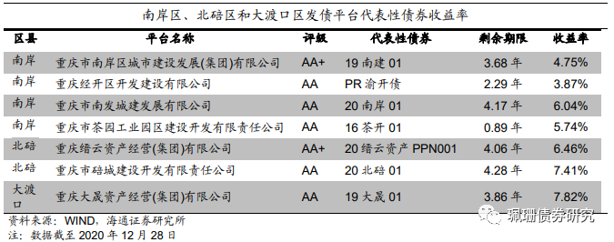 九龙坡区的发债平台有3家,分别为重庆渝隆资产经营(集团)有限公司、重庆高新区开发投资集团有限公司和重庆九龙园高新产业集团有限公司。其中,重庆高新区开发投资集团有限公司和重庆渝隆资产经营(集团)有限公司信用评级均为AA+,而重庆九龙园高新产业集团有限公司信用评级为AA。