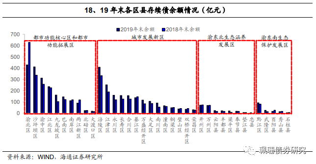 重庆市各区县2019年末存续债余额总计约为4104.66亿元,较18年末增加近331.6亿元。渝北区2019年末存续债余额较18年末有大幅下降,但仍金额最大,约为429亿元。此外,沙坪坝区、涪陵区2019年末存续债余额均较18年有所上升,突破400亿元大关。忠县、石柱县、垫江县18、19年末存续债余额均排名倒数三位。从五大功能区角度看,在有存续债余额的区县中计算,都市功能核心区和都市功能拓展区、城市发展新区、渝东北生态涵养发展区、渝东南生态保护发展区2019年末平均存续债余额分别约为205.42亿元、137.97亿元、29.64亿元、31.34亿元,较18年均有不同程度的上涨。
