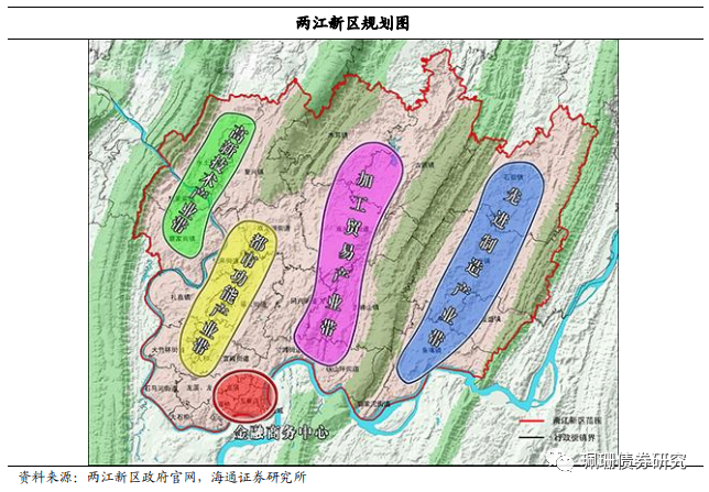 两江新区于2010年挂牌成立,是继上海浦东新区、天津滨海新区之后,国务院批准的中国第三个国家级开发开放新区,享有国家西部大开发新十年的各项政策、城乡统筹综合配套改革实验区政策及内陆保税港区等政策,产业布局总体为“一心四带”,其中“一心”指以江北嘴为主体的金融商务中心,“四带”指以直属区和悦来、两路为主体的都市功能产业带、以两路寸滩保税区为主体的物流加工产业带、以水土工业开发区和蔡家为主体的高新技术产业带和以鱼复、龙兴工业开发区为主体的先进制造产业带。两江新区的发债平台有4家,分别为重庆两江新区开发投资集团有限公司、重庆市江北嘴中央商务区投资集团有限公司、重庆保税港区开发管理集团有限公司和重庆悦来投资集团有限公司,重庆两江新区开发投资集团有限公司信用评级为AAA,其余三者评级均为AA+。