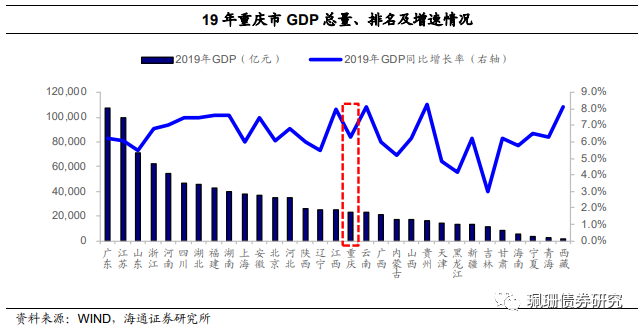 GDP、财政实力中上,广义债务率相对偏高。1)经济财政实力中上。2019年重庆市GDP总量位列全国31个省市中第17名,约为2.36万亿元。GDP构成中第三产业占比最大,且近年占比增长较快。财政实力总体一般,2019年重庆市综合财力达8109亿元,公共财政财力5000多亿,一般公共预算收入是2000多亿,其中税收是1500多亿,财政自给率较高。土地供给近年来比较多,政府性基金财力占比在全国前列,地价整体不贵,但是供应量大。2)人口密度大,金融资源较多。重庆常住人口和户籍人口均超过3000万,人口密度较高,其中户籍人口常年呈现净流出状态,一般是去一线城市和附近城市,北京、成都、深圳、上海这些地方去的比较多。常住人口常年低速增长,近10年年均增速不及1%。重庆金融资源较多,截至20年6月末各项存款余额约4.24万亿元,同比增加6.43%,受疫情影响政府存款增速为负,但住户存款和企业存款仍保持较高水平,尤其是普惠金融政策下企业存款增速上升。3)显性债务率低、广义债务率偏高。2019年重庆市狭义债务率约为69.10%,仅算入城投债券余额的广义债务率近120.17%,算入所有城投带息债务余额后,广义债务率约为232%,相对偏高。