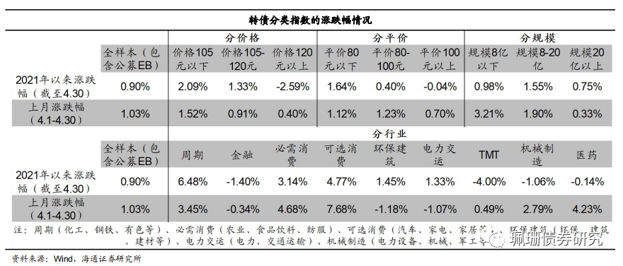 从风格来看,低价券及小盘券涨幅较大。4月低、中、高价券分别变动1.52%、0.91%和0.40%;债性、混合性、股性券分别变动1.12%、1.23%、0.70%;小盘、中盘、大盘券分别变动3.21%、1.90%和0.33%。