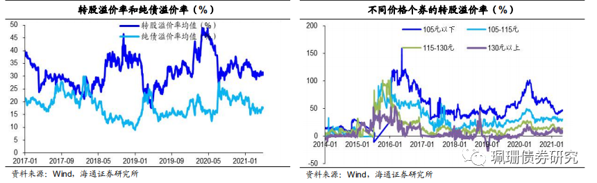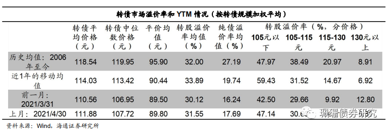 平均转股溢价率抬升。截至4月末全市场的转股溢价率均值31.55%,相比3月末上涨1.43个百分点;纯债溢价率均值17.69%,环比上升1.45个百分点。价格105元以下、105-115元、115-130元、130元以上转债的转股溢价率分别为47.14%、30.60%、14.21%、8.81%,环比分别变动4.63、0.93、4.29、-3.99个百分点。