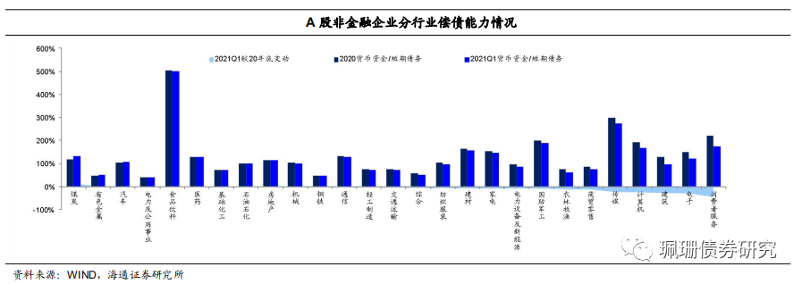 分行业来看,我们以货币资金/短期债务(短期借款+应付票据+一年内到期的非流动资产+应付短期债券)衡量行业的短期偿债能力,从绝对水平看,有色金属、综合、钢铁及电力及公用事业的短期偿债压力较重,21年一季度行业货币资金对短期债务的覆盖率均低于52%,商贸零售、轻工制造、交通运输、基础化工行业也都在80%以下的偏低水平。而食品饮料、传媒、消费者服务等下游消费行业,以及国防军工行业资金相对充裕,短期偿债能力较强。