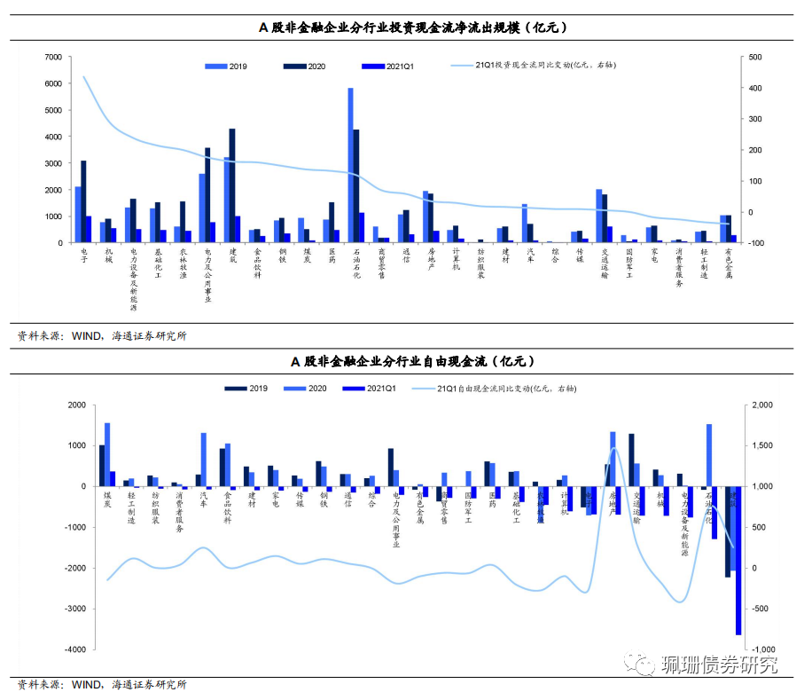 1)房地产行业自由现金流缺口缩窄,筹资现金流转负。21年一季度上市房地产企业自由现金流缺口为689.3亿元,与去年同期相比有所收窄,但资金缺口问题依然存在;同时期房地产企业筹资现金流由正转负,再融资压力加大。2)建筑行业自由现金流缺口与筹资现金流规模较大,一季度缺口缩窄。21年一季度上市建筑企业自由现金流缺口为3637.5亿元,与去年同期相比缺口缩减254.4亿元;同时建筑企业筹资现金流较去年同期有所减少,融资放缓。3)石油石化行业自由现金流一季度改善,筹资现金流缩减。21年一季度上市石油石化企业自由现金流缺口为1286.9亿元,与去年同期相比缺口下降746.8亿元;一季度石油石化企业筹资现金流较去年同期减少701.5亿元,规模在行业中同样排名靠前。