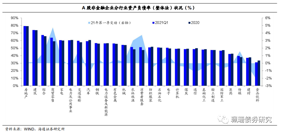 分行业来看,房地产和建筑行业上市公司资产负债率仍旧是最高的,超过70%,且21年一季度房地产行业与20年末大致持平,维持79.2%左右的水平,依旧是高杠杆模式;建筑行业21年一季度为73.9%,较20年末下降0.7个百分点。整体来看,一季度市场大部分行业负债率都较去年底有所上升,其中商贸零售、消费者服务及农林渔牧等行业资产负债率上升较快,21年一季度分别提升约4.7、3.7及3.0个百分点;而负债率下降较多的行业包括食品饮料、汽车及通信等,资产负债率分别较20年末下降约2.4、1.5及1.2个百分点。