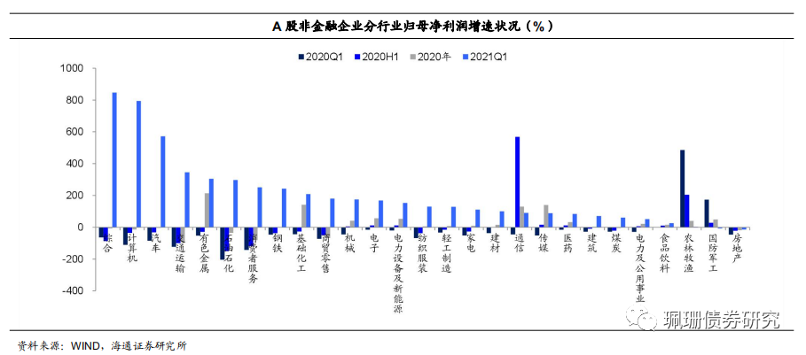 资源能源、交通运输和原材料企业盈利仍较乐观,21年一季度增幅较大。我们根据中信行业分类将上市非金融公司分为资源能源、原材料、设备制造、工业服务、科技类、消费类和金融地产几个大的板块,从各板块利润总额同比增速情况看,21年一季度各板块盈利增速皆上升,其中资源能源、交通运输和原材料企业利润总额同比增速上升幅度较明显,特别是资源能源21年一季度利润总额同比增速大幅提升至2982.9%,远高于其他板块。其次为交通运输, 21年一季度利润总额同比增速为350.6%。