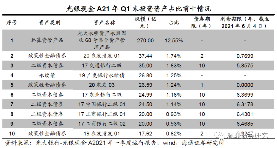 “光银现金A”是光大银行于2018年2月成立的现金管理类理财产品,存续至今经历了《关于规范现金管理类理财产品管理有关事项的通知(征求意见稿)》的出台,现对其具体资产配置情况进行分析,借此了解新规下其整改进程。国债、央行票据、政金债投资占比提升,流动性整改成效显著。以光大银行典型现金管理类理财产品——光银现金A为例,征求意见稿出台后,资产配置中持有现金或到期日在一年以内的国债、央行票据、政策性金融债券占比大幅提升,2020年始终保持大于5%的占比,21年Q1该占比达到8.6%,相比19年末提升4.1个百分点,达到、甚至超过了征求意见稿的要求标准,更加注重流动性管理。新增对于私募资产管理产品的投资。20年上半年光银现金A调整资产配置,增持资管产品-固定收益类投资,“光大永明资产永聚固收68号集合资产管理产品”成为第一大重仓资产,占比达到11%,此后光银现金A一直保持对该资产的高持仓。资产管理产品是已经经过资产配置、权衡风险与收益的投资组合,具有风险管理能力强、收益率高的特点,能够帮助现金类理财产品优化配置,21年Q1该私募产品占比增至13%。![]()