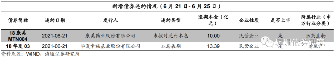 本周新增违约债券2只。分别为18康美MTN004、18华夏03。具体来看:18康美MTN004违约本金10.00亿元,发行主体为康美药业股份有限公司。债券违约原因为公司净利润出现大幅亏损,目前正在进行重整。18华夏03违约本金13.39亿元,发行主体为华夏幸福基业股份有限公司。债券违约原因为在宏观经济环境、行业环境、信用环境叠加多轮疫情影响下,公司流动性出现阶段性紧张。![]()