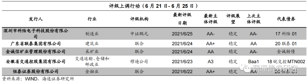 本周有5项信用债主体评级上调,8项信用债主体评级下调,与上周相比,主体评级上调和下调数量均有所增加。本周评级上调的发行人共5家,分别为深圳市科陆电子科技股份有限公司、广东省联泰集团有限公司、金诚信矿业管理股份有限公司、安徽省交通控股集团有限公司、恒泰证券股份有限公司。深圳市科陆电子科技股份有限公司,非城投平台,来自制造业,中证鹏元于21年6月25日将公司评级展望由“负面”调整为“稳定”。广东省联泰集团有限公司,非城投平台,来自建筑业,评级由AA上调为AA+,评级展望为“稳定”,评级上调原因为2020年公司资产及权益规模保持增长,工程施工业务大幅增长带动营业收入有所增加,高速公路运营、环保产业及房地产板块发展情况良好。金诚信矿业管理股份有限公司,非城投平台,来自采矿业,评级由AA-上调为AA,评级展望为“稳定”,评级上调原因为跟踪期内,公司经营业绩稳步提升,公司在国内矿山开发服务行业内保持较强竞争实力,在手订单较为充足。安徽省交通控股集团有限公司,城投平台,来自交通运输、仓储和邮政业,评级由Baa1上调为A3,评级展望为“稳定”,评级上调原因为穆迪预计安徽交控的收费公路业务将继续呈现稳定的运营业绩;非收费公路业务的投资规模仍将可控;公司不会进行大规模举债的并购交易;获得政府特殊支持的可能性较高。恒泰证券股份有限公司,非城投平台,来自金融业,评级由AA上调为AA+,评级展望为“稳定”,评级上调原因为2020年公司整体业务经营尚可,保持较强竞争力和资本实力,所有者权益稳定性较好,杠杆水平适中,资本充足性良好。