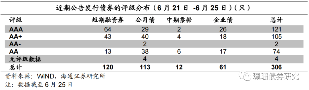 根据Wind统计,本周短融发行1302.3亿元,到期1031.6亿元,中票发行569.1亿元,到期287.7亿元;企业债发行104.6亿元,到期69.4亿元;公司债发行887.5亿元,到期237.1亿元。本周主要信用债品种共发行2863.5亿元,到期1625.8亿元,净供给1237.7亿元,较前一个交易周(6月15日-6月18日)的376.7亿元有所增加。从主要发行品种来看,本周共发行短融超短融120只,中期票据61只,公司债发行113只,企业债发行12只,发行数量较前一周有所增加。从发行人资质来看,AAA等级发行人占比最大为39.5%。从行业来看,建筑业发行人占比最大为30.1%,其次为综合类发行人,占比为23.9%。在发行的306只主要品种信用债中,有40只城投债,占比约13.1%,发行数量比上周有所增加。![]()