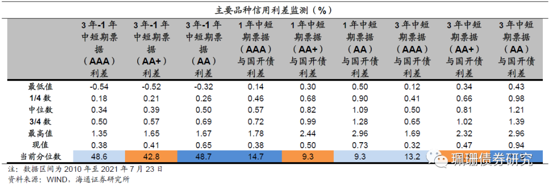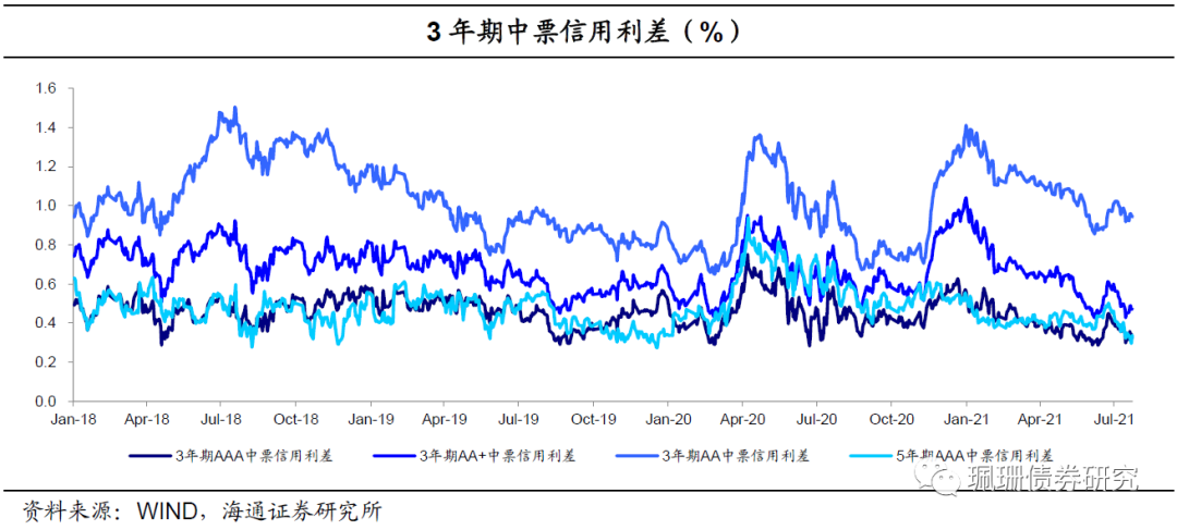 信用债期限利差走扩。具体来看,截至7月23日,5年期和3年期的AAA中票期限利差为30BP,较上周末上行6BP;5年期和3年期的AA中票期限利差为52BP,较上周末上行8BP;5年期和1年期AAA中票的期限利差为68BP,较上周末上行1BP。