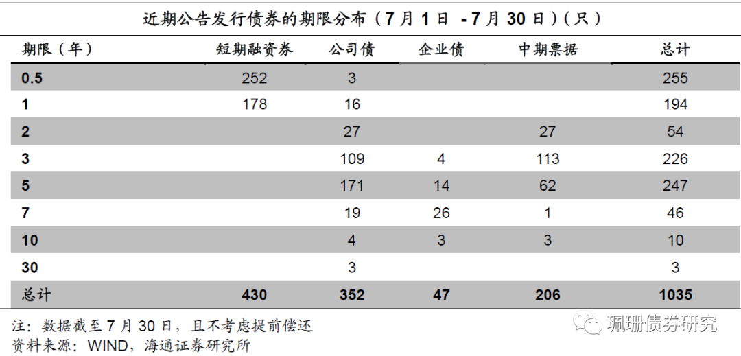 根据Wind统计,根据Wind统计,7月短融发行4492.1亿元,到期4156.2亿元,中票发行2107.0亿元,到期1318.6亿元;企业债发行430.7亿元,到期314.5亿元;公司债发行3146.7亿元,到期2152.7亿元。7月主要信用债品种共发行10176.4亿元,到期7942.0亿元,净供给2234.4亿元,较前一个交易月(6月1日-6月30日)的2710.2亿元有所减少。