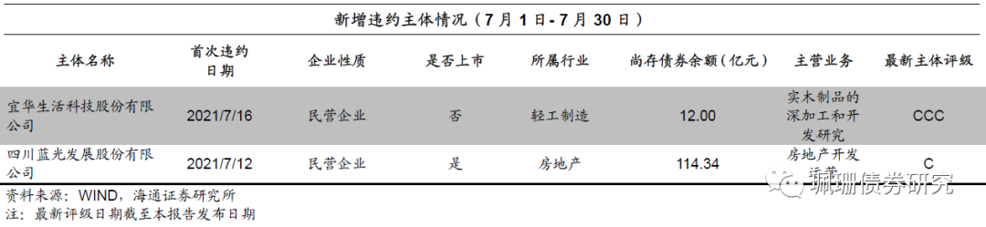 7月新增违约主体2家,分别为宜华生活科技股份有限公司、四川蓝光发展股份有限公司。
