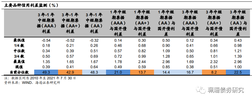 信用债期限利差分化。具体来看,截至7月30日,5年期和3年期的AAA中票期限利差为27BP,较上月末下行3BP;5年期和3年期的AA中票期限利差为46BP,较上月末上行2BP;5年期和1年期AAA中票的期限利差为67BP,较上月末下行7BP。