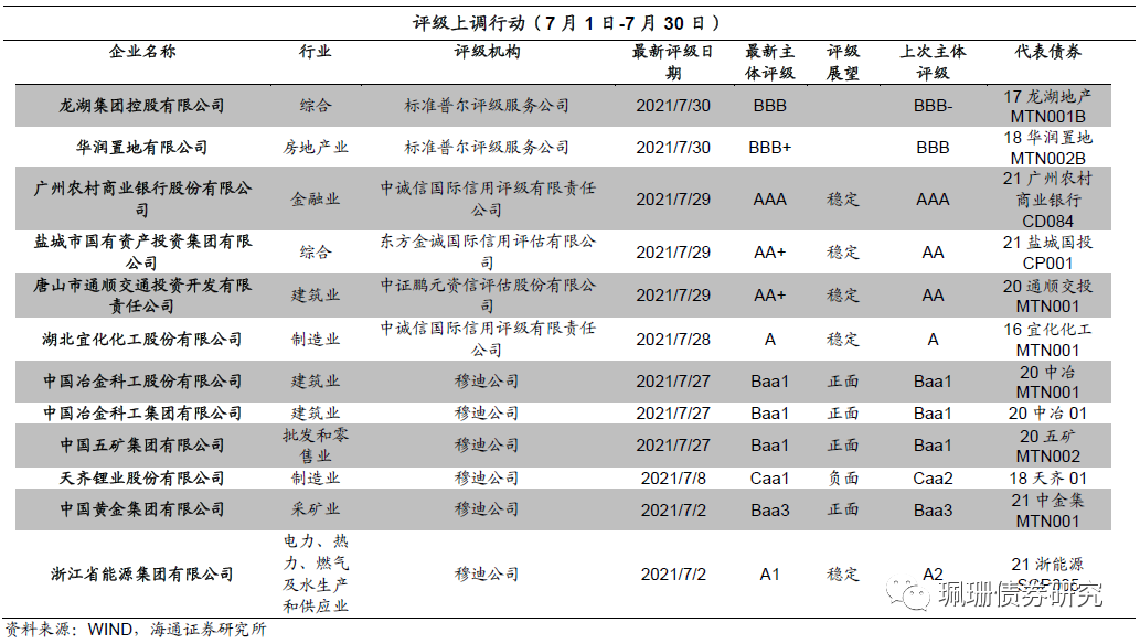 7月评级上调的发行人共有12家,分别为龙湖集团控股有限公司、华润置地有限公司、广州农村商业银行股份有限公司、盐城市国有资产投资集团有限公司、唐山市通顺交通投资开发有限责任公司、湖北宜化化工股份有限公司、中国冶金科工股份有限公司、中国五矿集团有限公司、中国冶金科工集团有限公司、天齐锂业股份有限公司、中国黄金集团有限公司、浙江省能源集团有限公司。