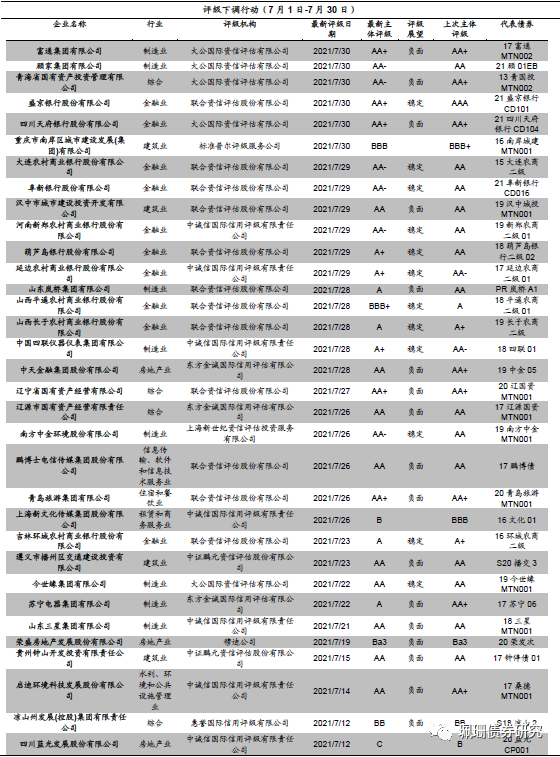 7月评级下调的发行人共有38家,分别为富通集团有限公司、顾家集团有限公司、青海省国有资产投资管理有限公司、盛京银行股份有限公司、四川天府银行股份有限公司、重庆市南岸区城市建设发展(集团)有限公司、大连农村商业银行股份有限公司、阜新银行股份有限公司、汉中市城市建设投资开发有限公司、河南新郑农村商业银行股份有限公司、葫芦岛银行股份有限公司、延边农村商业银行股份有限公司、山东岚桥集团有限公司、山西平遥农村商业银行股份有限公司、山西长子农村商业银行股份有限公司、中国四联仪器仪表集团有限公司、中天金融集团股份有限公司、辽宁省国有资产经营有限公司、辽源市国有资产经营有限责任公司、南方中金环境股份有限公司、鹏博士电信传媒集团股份有限公司、青岛旅游集团有限公司、上海新文化传媒集团股份有限公司、吉林环城农村商业银行股份有限公司、遵义市播州区交通建设投资有限公司、今世缘集团有限公司、苏宁电器集团有限公司、山东三星集团有限公司、荣盛房地产发展股份有限公司、贵州钟山开发投资有限责任公司、启迪环境科技发展股份有限公司、凉山州发展(控股)集团有限责任公司、四川蓝光发展股份有限公司、珠江人寿保险股份有限公司、贵州六盘水攀登开发投资贸易有限公司、幸福人寿保险股份有限公司等发行人。