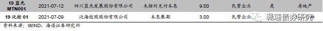 7月新增违约债券22只。具体来看,20蓝光CP001、19蓝光02、19蓝光MTN001,违约本金分别为7.00亿元、9.93亿元、9.00亿元,19蓝光07、19蓝光01、20蓝光04、19蓝光04、20蓝光02、16蓝光01均为提前到期未兑付,发行主体为四川蓝光发展股份有限公司,为民营企业。违约原因为公司流动性出现阶段性紧张。