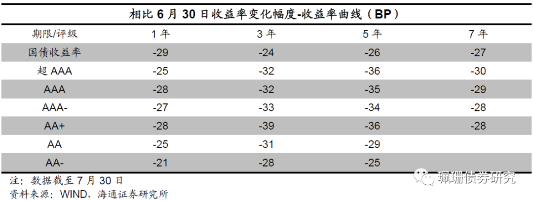 相比6月30日协会估值, 7月(7月28日)信用债估值收益率下行为主。