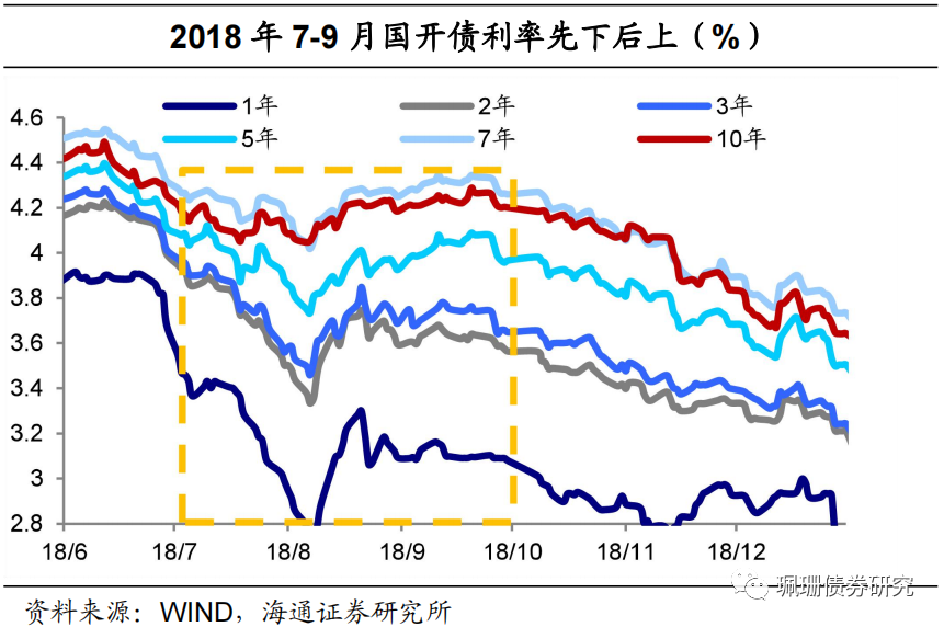 2018年7-9月(地方债8-9月发行加速)利率先下后上,短端大幅下行,长端涨跌互现。2018年8月14日,财政部发文《关于做好地方政府专项债券发行工作的意见》,要求加快专项债券发行进度,特别是8、9月加快进度,各地至9月底累计完成新增专项债券发行比例原则上不得低于80%,剩余的发行额度应当主要放在10月份发行。受益于7月初定向降准0.5%个百分点释放7000亿资金,货币宽松程度进一步加码,货币市场利率大幅下降,再加上央行通过MLF资金支持银行投资信用债,资管新规补充文件利好短债(现金类理财计量方式放宽、银行理财门槛降低、允许老产品投资新资产同时禁止期限错配),短债利率大幅下行,而长端利率有涨有跌,10Y国债/国开/非国开利率分别变动+13/-5/3BP。![]()