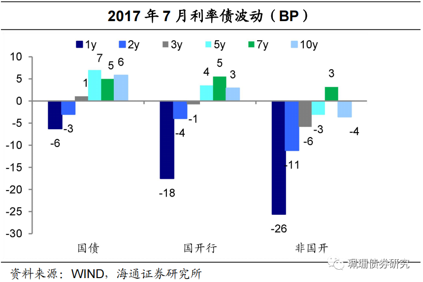 2017年7月长端利率小幅上行。经历过17年6月债市大涨后,7月债市震荡。17年7月缴税缴准曾短暂冲击流动性,但随后央行大规模投放资金保证了流动性的平稳,金融工作会议定调强监管防风险,金融监管推进放缓,市场情绪短期平稳,经济短期走平,海外美元走弱,债市陷入多空对峙状态,10年期国债收益率月内波动幅度仅有6BP。整个7月短债利率下行,10Y国债/国开/非国开利率分别变动+6/+3/-4BP。![]()