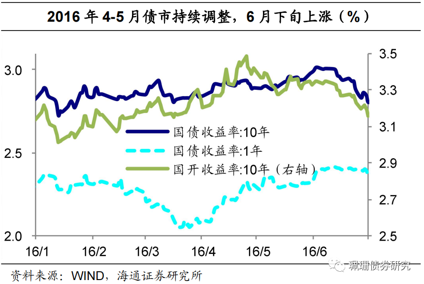 2016年4月债市大跌。16年4月收益率大幅上行,同时曲线变平,短端利率(1Y国债利率)上行幅度超过20BP,长端利率(10Y国债利率)上行幅度在5-20BP之间,政策性银行债跌幅远大于国债。当时债市调整除了供给因素,还有货币政策边际调整因素(货币政策转向稳健、缴税缴准扰动资金面先松后紧)、监管因素(如市场担忧“营改增”增加隐性回购成本和政金债投资成本、资管业去杠杆担忧)、美联储加息、信用风险冲击、大宗商品价格大涨等因素也对债市形成冲击。16年4月,10Y国债/国开/非国开利率分别变动+5/+18/+24BP。2016年6月债市反弹。到了6月,尽管供给压力仍大,但随着经济金融数据走弱,英国退欧导致全球避险情绪升温,国内降准预期再起,加之资金面担忧缓解,债市开始上涨,16年6月,10Y国债/国开/非国开利率分别变动-14/-14/-20BP。![]()