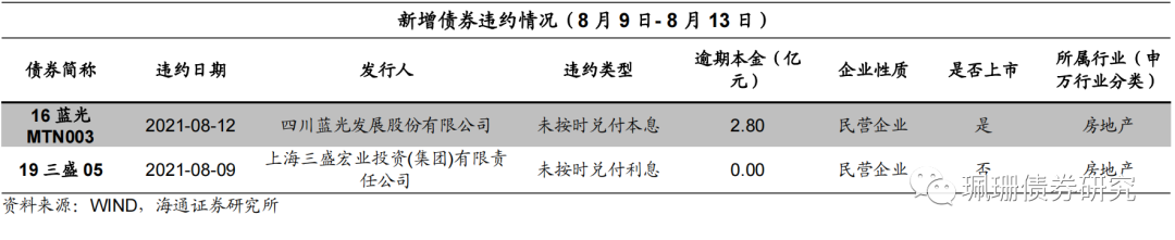 本周新增违约债券2只,分别为16蓝光MTN003、19三盛05。具体来看: