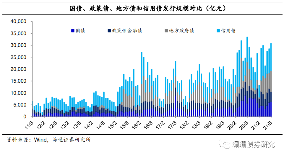 年内社融增速的抬升或由地方债拉动而非宽信用明显启动。8月地方债总供给8797亿元(含8月31日计划发行),远不及我们此前统计的超万亿元的计划发行规模(《利率债周报20210822:经济弱资金松,债市供需两旺》),总的来看8月政府债净融资规模9500多亿元,而去年同期政府债当月增量近1.4万亿元,预计8月社融增速或将继续放缓。展望后续,受去年政府债融资高基数影响,预计9月~11月政府债融资仍将拖累社融、12月或因地方债预留发行而带动社融增速有所抬升,年末增速或在10.4%~10.5%。