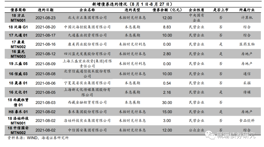 8月新增违约债券13只。分别为18方正MTN001、18泛海G1、17九通01、17康美MTN002、16蓝光MTN003、19三盛05、16信威03、18晟晏01、16文化01、18西藏租赁债01、H8泰禾01、18洛娃科技MTN001、18中信国安MTN002。