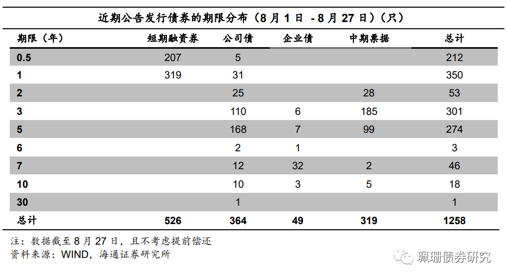 根据Wind统计,截至8月27日,8月短融发行4605.1亿元,到期4272.3亿元,中票发行3197.2亿元,到期1965.5亿元;企业债发行456.6亿元,到期407.9亿元;公司债发行3270亿元,到期1988.8亿元。8月主要信用债品种共发行11528.9亿元,到期8634.6亿元,净供给2894.2亿元,较前一个交易月(7月1日-7月31日)的2234.4亿元有所增加。