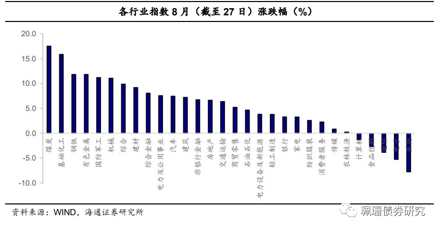 行业涨多跌少。8月创业板指明显回调,国证2000涨幅领先,周期表现较好,如煤炭、基础化工、钢铁等,医药、电子、通讯、食品饮料、计算机回调。成交上看8月每日沪深两市成交均超过万亿,情绪较高,环比7月日均上涨9%。