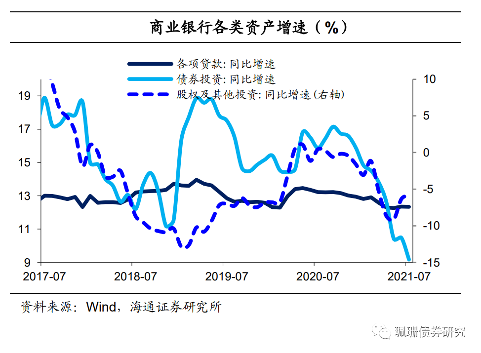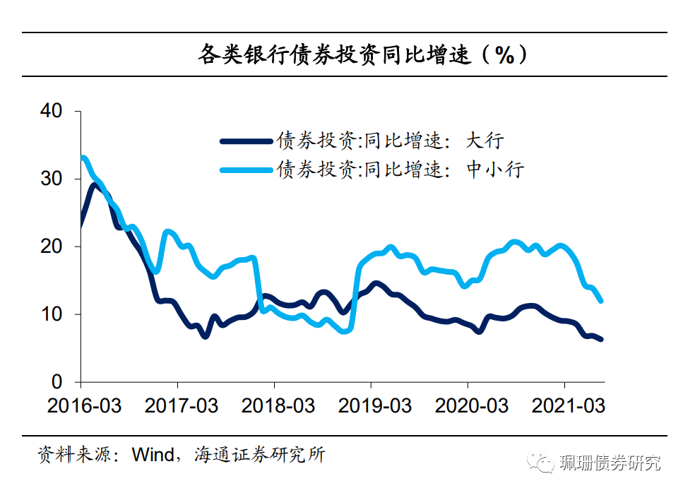 银行债券仓位低,配债空间有望回升,对冲政府债券供给。今年以来,银行债券投资增速与占比纷纷回落,上市银行债券占比创2016年以来新低。从月度数据看,银行债券投资增速在7月降至个位数(20年9月的17%降至21年7月的9%)、降幅远高于债市规模同比降幅(20年9月的19%降至21年7月的14%),其中大行债券投资增速创2015年以来新低、中小行增速创2019年以来新低。虽然后续政府债发行量仍大,但房地产信贷严监管、城投控制债务增速,意味着银行债券配置空间提升有望对冲部分供给压力。