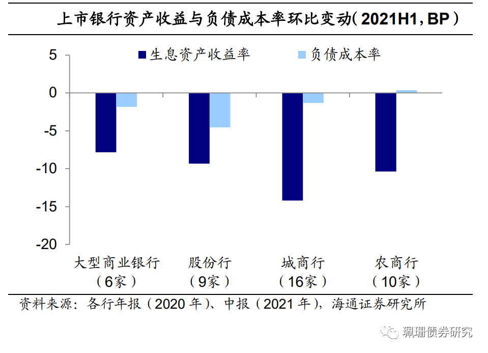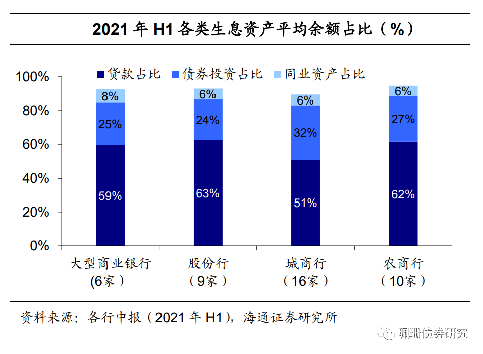 生息资产结构中,贷款占比均上升,债券投资占比下降,同业资产占比分化,城商行微升其余下降。从2021年H1上市银行的生息资产结构变化看,农商行贷款占比提升幅度最大、为2.2pct,城商行的债券投资占比下降幅度最大、为1.4pct。除城商行小幅上升0.1pct外,同业资产占比普遍下降,其中农商行下降幅度最大、为1.1pct。