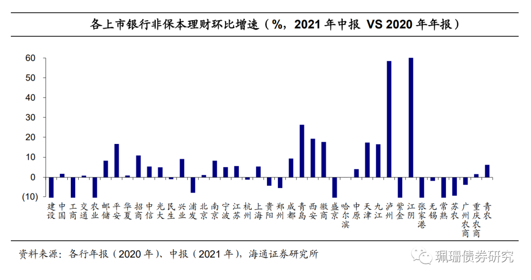 2021年H1,41家A、H股上市银行(45家上市银行中剔除重庆、甘肃、天津、九台农商银行)表外非保本理财总规模为21.6万亿元,同比增长0.2%,环比减少1.8%。理财规模同比和环比增长银行家数分别为29家和27家。城商行理财规模的增幅较大,同比增速达到10%,环比增速5.4%。工商银行、招商银行非保本理财规模最大,均突破2万亿元。