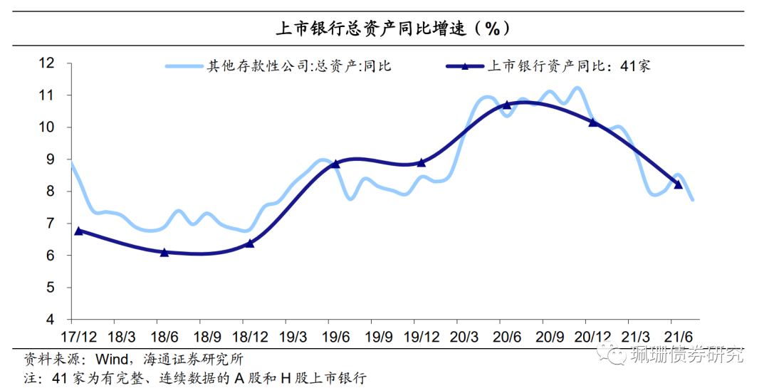 银行扩表速度放慢。中央经济工作会议政策要求“保持宏观杠杆率基本稳定”,2021年上半年稳杠杆政策诉求持续兑现,商业银行开始减速扩表。从总资产同比增速看,41家银行中有26家银行总资产同比增速相较20年末下降,降幅最大的为青岛银行下降9.2个百分点,有3家同比负增长,分别为盛京银行(-3.96%)、民生银行(-1.02%)、哈尔滨银行(-0.95%);从总资产环比增速看,41家银行总资产仅两家增速为负,分别为盛京银行(-2.07%)、中原银行(-0.59%)。