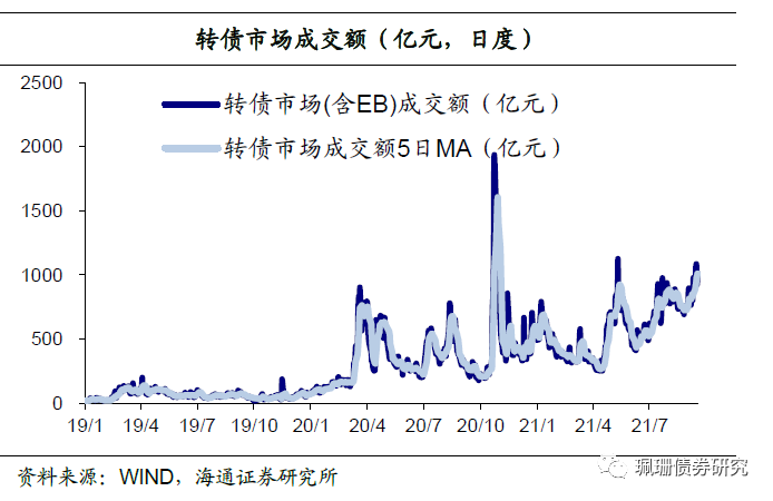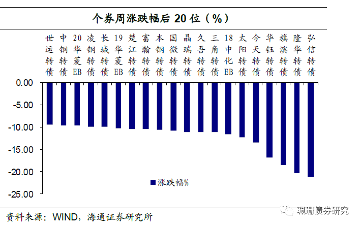 个券表现,涨少跌多。个券54涨3平333跌。个券涨幅前5位分别是清水转债(66.53%)、新春转债(27.41%)、天能转债(27.36%)、银河转债(23.39%)、飞鹿转债(17.79%)。跌幅前5位分别是弘信转债(-21.25%)、隆华转债(-20.35%)、旗滨转债(-18.52%)、华钰转债(-16.80%)、今天转债(-13.47%)。