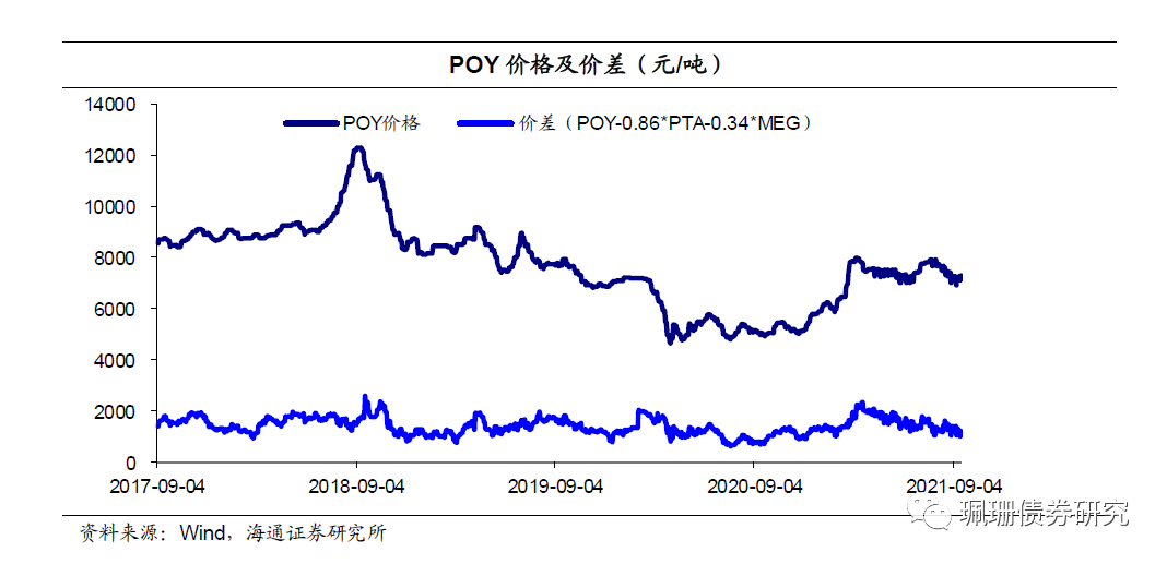 涤纶长丝POY价差收窄。截至9月18日,华东地区涤纶长丝POY价格为72.75元/吨,价差为1192元/吨,周环比分别上涨75元/吨、收窄118.6元/吨。