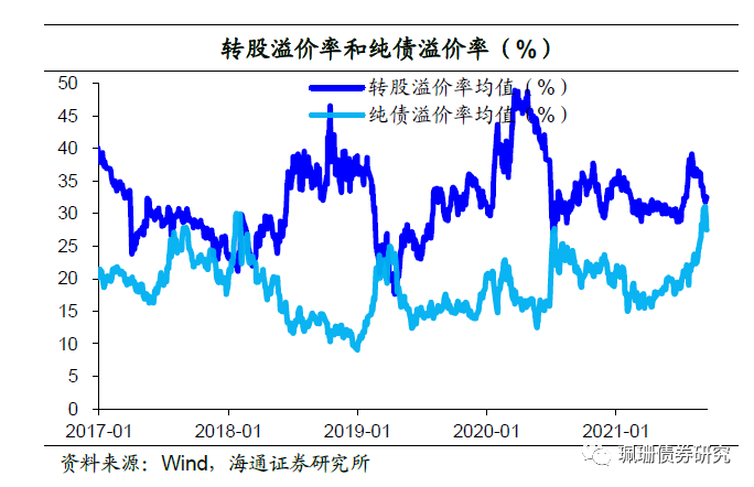 其中价格105元以下转债的转股溢价率均值53.06%,环比下跌12.05个百分点;105-115元转债的转股溢价率均值41.86%,环比下跌0.12个百分点;115-130元转债的转股溢价率均值17.84%,环比下跌4.83个百分点;130-170元转债的转股溢价率均值13.25%,环比上涨0.17个百分点;而价格170元以上转债的转股溢价率均值10.30%,环比上涨0.25个百分点。