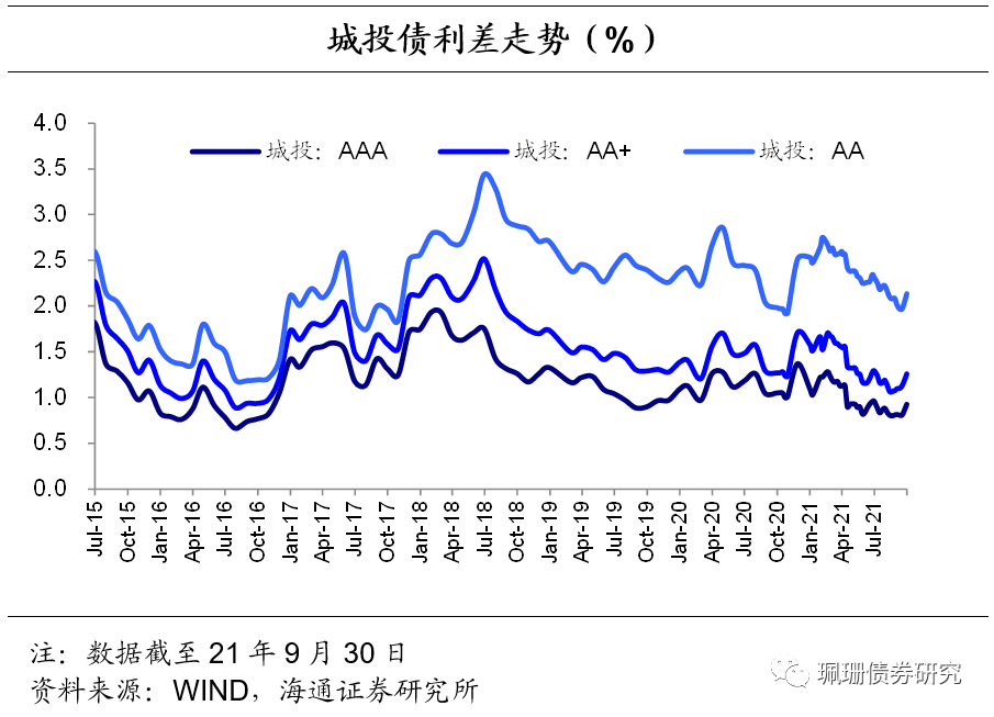 9月城投债利差走扩。具体来看,截至9月30日,9月城投债AAA级利差为93BP,较8月末上行12BP;城投债AA+级利差为126BP,较8月末上行19BP;城投债AA级利差为213BP,较8月末上行5BP。