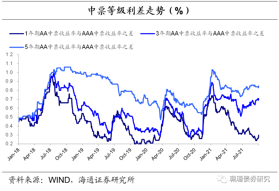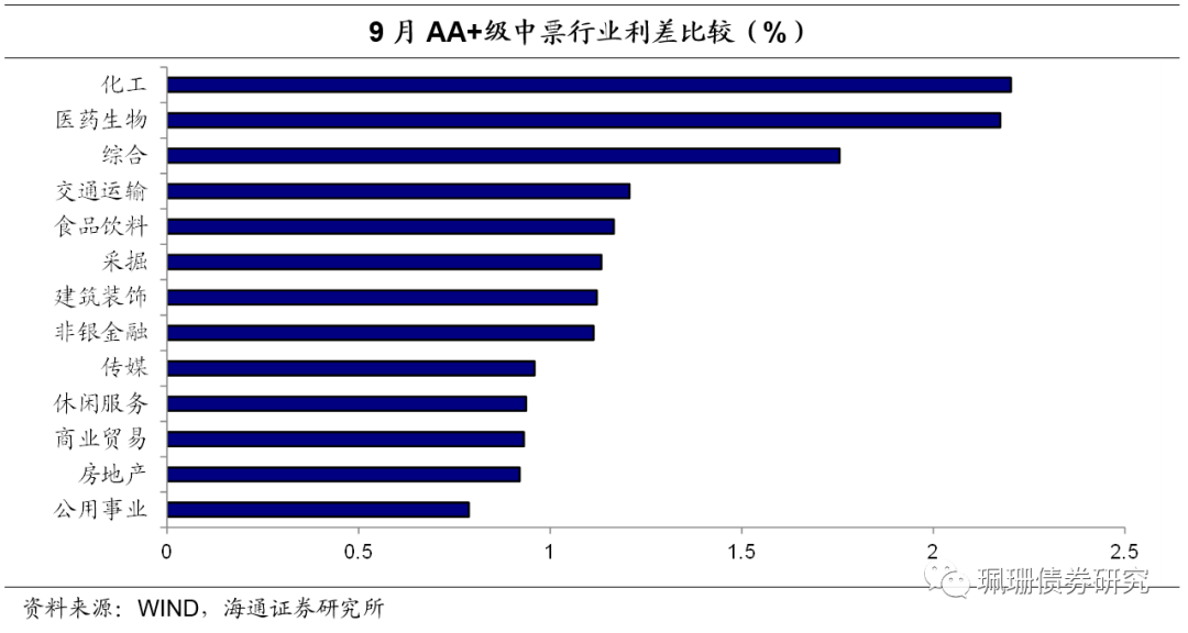 信用债等级利差分化。具体来看,截至9月30日,1年期短期品种AA级与AAA级中票利差为30BP,较8月末上行3BP;3年期AA级与AAA级中票利差为71BP,较8月末上行4BP;5年期AA级与AAA级中票利差为85BP,较8月末下行1BP。