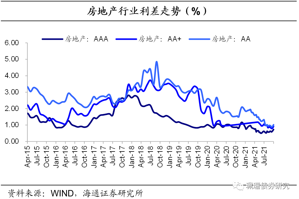 地产行业信用利差走扩。具体来看,截至9月30日,AAA级房地产行业信用利差73BP,较8月末上行11BP;AA级房地产行业信用利差102BP,较8月末上行5BP。