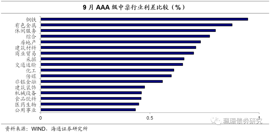 行业利差监测与分析:1)9月债市信用利差分化。具体来看,等级利差分化,期限利差分化。2)产业债与城投债利差分化。9月城投债利差走扩;产业债与城投债利差分化,AA等级城投表现显著好于产业债。3)行业横向比较:高等级债中,钢铁、有色金属是利差最高的两个行业。AAA级钢铁行业中票平均利差为95BP,AAA级有色金属行业中票平均利差为88BP。其次是休闲服务,其利差为80BP。公用事业是平均利差最低的行业,目前为43BP。