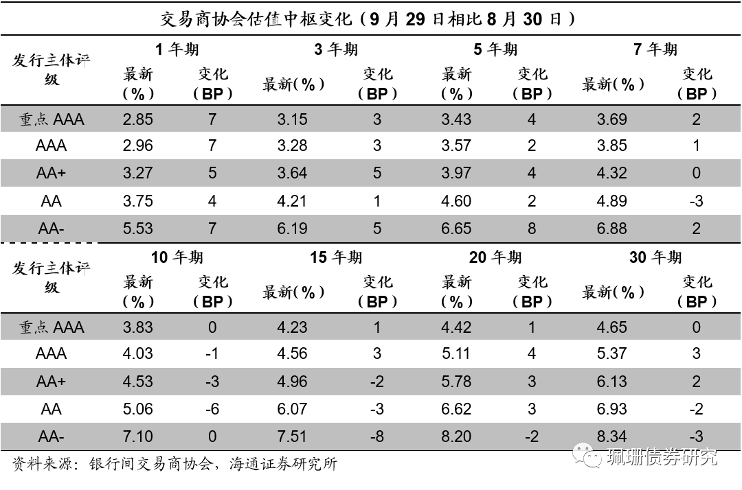 相比8月30日协会估值,9月(9月29日)信用债估值收益率上行为主。
