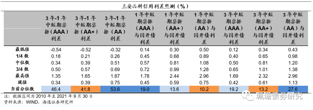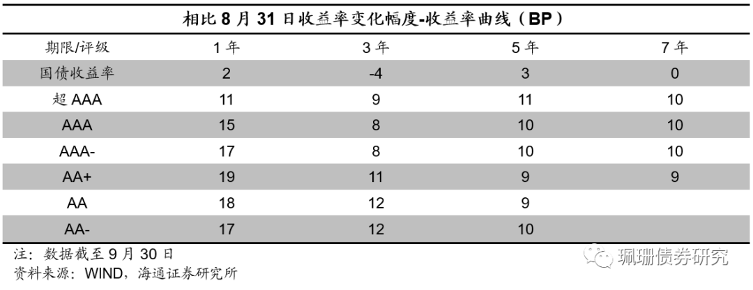 信用债期限利差分化。具体来看,截至9月30日,5年期和3年期的AAA中票期限利差为33BP,较8月末上行2BP;5年期和3年期的AA中票期限利差为47BP,较8月末下行3BP;5年期和1年期AAA中票的期限利差为67BP,较8月末下行5BP。
